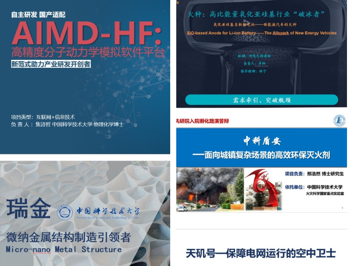 化学与材料科学学院李阳负责的《火种:高比能量氧化亚硅基行业“破冰者”》,工程科学学院张倩倩负责的《高精度微纳三维金属结构的高效加工方法研究》,工程科学学院王亚豪负责的《配网带电作业机器人的研究与产业化》,火灾科学国家重点实验室邢浩然负责的《中科盾安—面向城镇复杂场景的高效环保灭火剂》,微尺度国家研究中心焦诗哲负责的《AIMD-HF:高精度分子动力学模拟软件平台》等五个项目依次进行了项目路演。