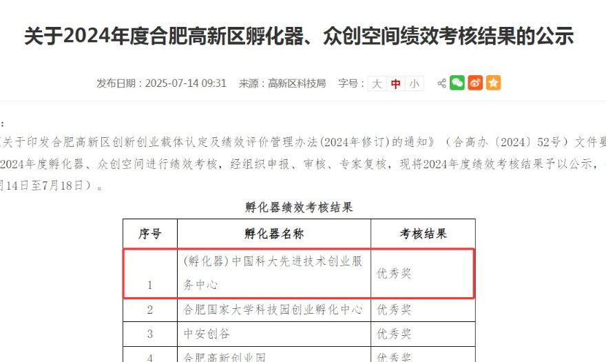 发布时间:2025年07月22日作者:本站编辑 来源:本站原创近日,合肥高新区科技局公布《2024年度合肥高新区孵化器、众创空间绩效考核结果》,中国科大先进技术创业服务中心以优异成绩获得孵化器、众创空间考核“双优秀”。